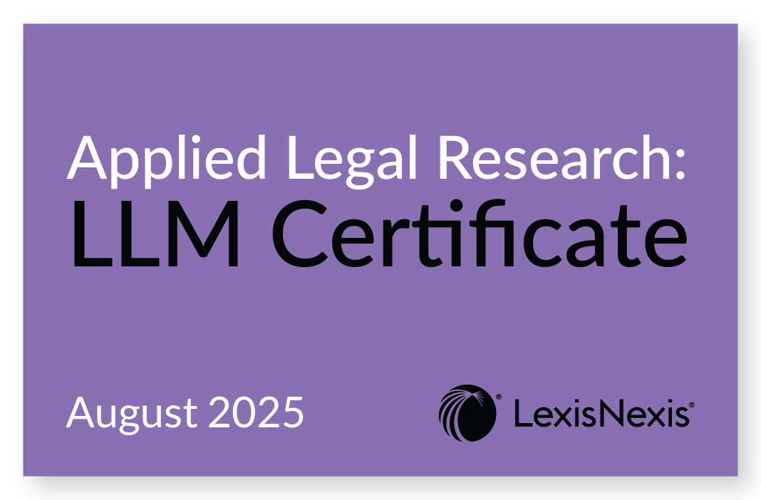 This certificate confirms the completion of LexisNexis® Applied Legal Research for LLM on August 25, 2025.