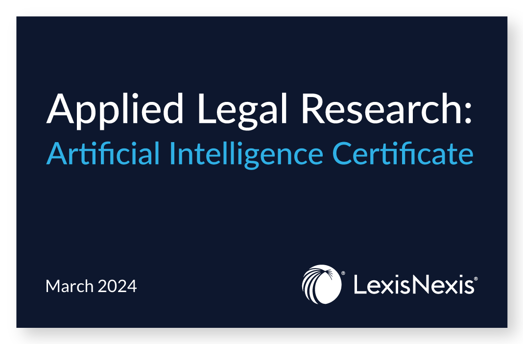 This certificate confirms the completion of LexisNexis® Applied Legal Research for Artificial Intelligence on March 7, 2024.